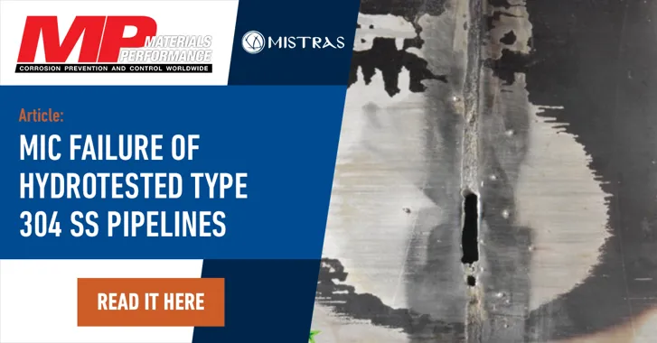 MISTRAS Group (NYSE: MG) authored an article published in Materials Performance Magazine, entitled “MIC Failure of Hydrotested Type 304 SS Pipelines.” This article discusses leaks detected on a pipeline during hydrotesting and elaborates on the methods used to determine the root cause of the failure.